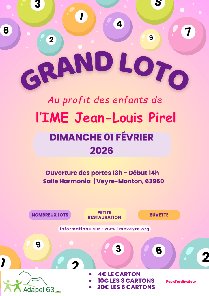 Dimanche 1er février 2026, l’Institut Médico-Éducatif Jean-Louis Pirel de Veyre-Monton organise pour la première fois un grand loto solidaire à la salle Harmonia de la commune.